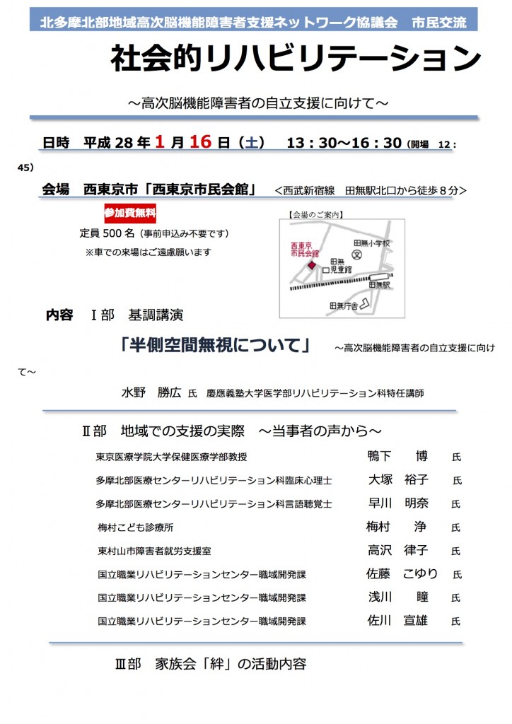北多摩北部地域高次脳機能障害者支援ネットワーク協議会では下記の要領で市民向けの講演会を行います。私は交通事故後間もない時期の状態について、当時、高次脳機能障害の視点をもって、彼に接していなかった反省も含めてレポートする予定です。